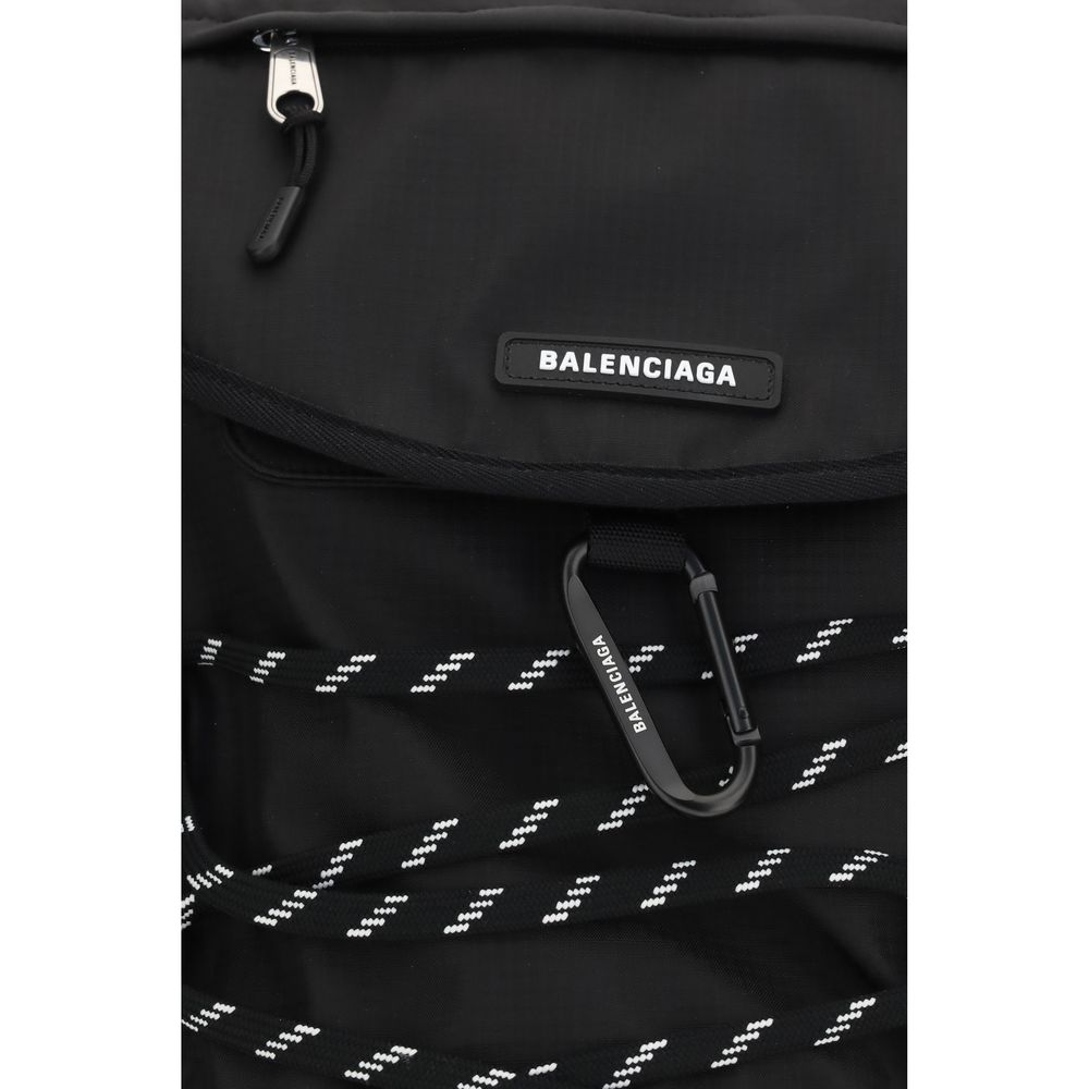 The Backpack featuring a technical and contemporary design by Balenciaga, ideal for an urban and dynamic lifestyle. Crafted from durable black material, it showcases a structured silhouette with a top flap and zip closure for added security and practicality.A standout detail is the front lace-up system with contrasting cord and a metal carabiner, adding a sporty and functional touch. The Balenciaga logo on the flap completes the clean yet distinctive look.Equipped with mesh side pockets, perfect for small essentials or bottles, and adjustable shoulder straps for maximum comfort. The top handle allows for alternative hand carry. A perfect everyday accessory that blends technical functionality with modern style.
