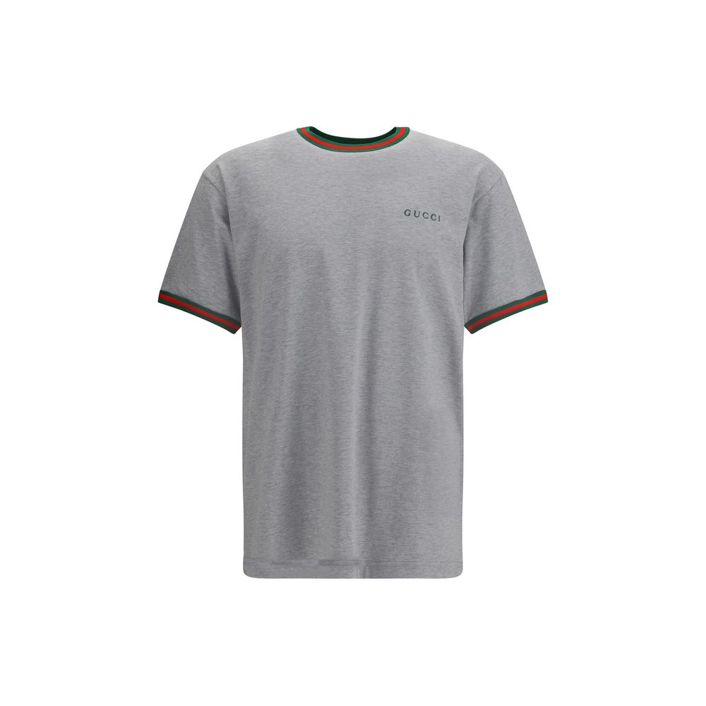 Light grey melange cotton T-shirt with Gucci embroidery on the chest and contrasting Web details.